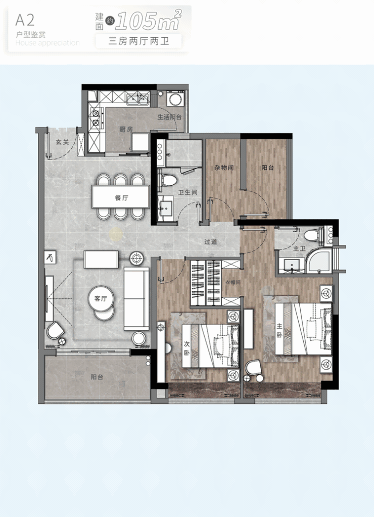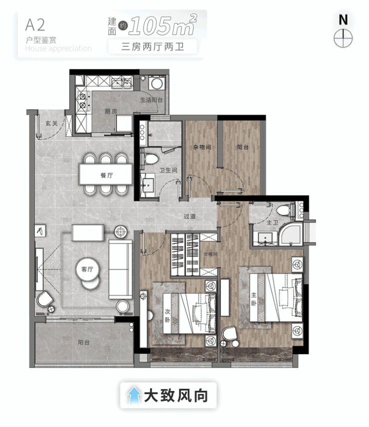 住宅产品设计方面,项目主打105㎡与125㎡两大改善型户型序列。产品设计逻辑强调家庭成长周期空间适配。105㎡户型采用三开间朝南布局结构。建筑学中,南向开间比例越高,室内自然采光效率越高。客厅、主卧、次卧均南向排布,使室内形成连续日照带。约3.9米宽厅空间使公共活动区尺度更加舒展。LDKB一体化空间设计打破传统分隔式住宅结构,强化家庭互动场景。