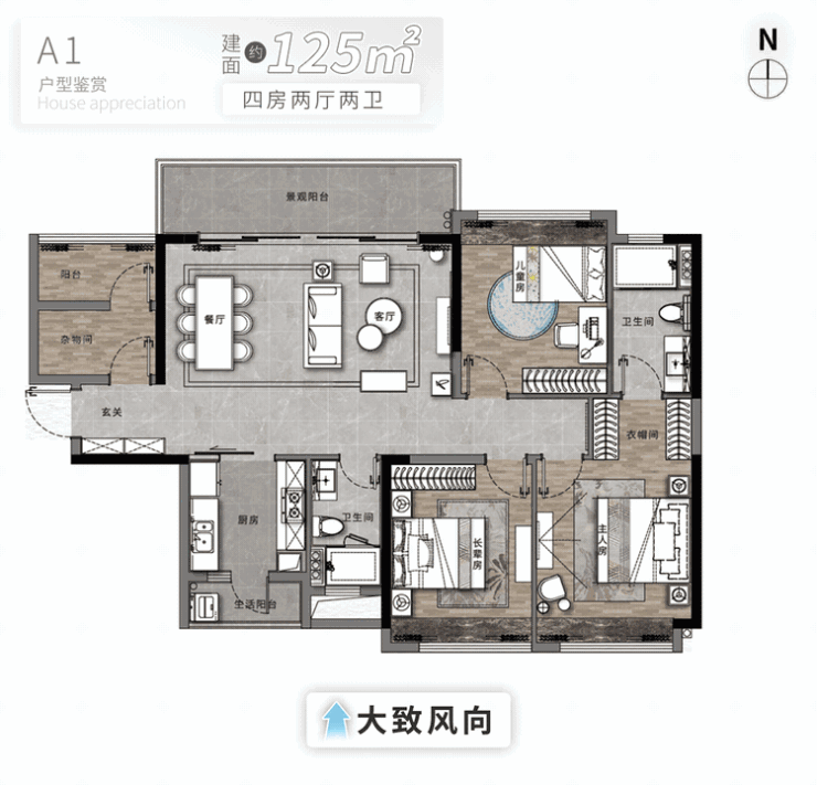 125㎡户型更强调景观体验与空间尺度感。约6.5米横厅结构属于改善型住宅中较高配置标准。超宽阳台设计能够最大限度引入大夫山生态景观视野。主卧空间配置步入式衣帽间及独立卫浴系统。主卫空间面积超过6平方米,能够容纳双人使用需求。空间动线设计强调居住私密区与公共区分离。