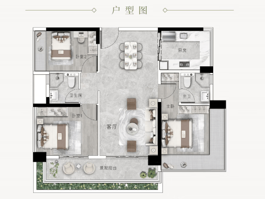 升级高配交付标准,包括西门子厨房三件套、客餐厅地面贴大块瓷砖、卫生间墙身贴岩板、智能马桶、全屋风管机+空调等高端配置。