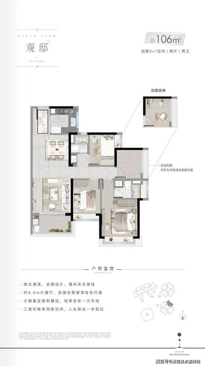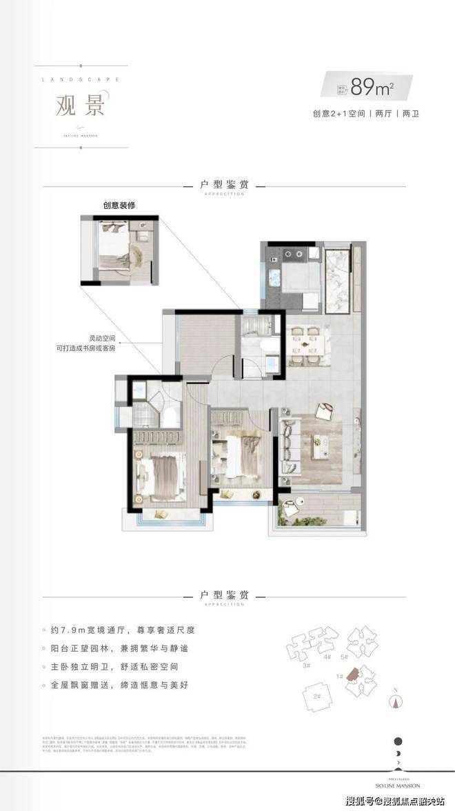 项目主力户型为89-121㎡三至四房,得房率超85%,远高于市场平均水平。89㎡户型实现三房两卫,7.9米客餐一体通厅设计,空间感媲美大户型;106㎡3+1房可做四房,全明设计,部分高层三开间望江;121㎡王牌户型配备10.5米朗阔通厅、6.6米观景阳台,主卧套间带阔景飘窗,餐厨一体化设计增强家庭互动。此外,项目还提供41-53㎡灵动空间,41㎡双钥匙户型可“一层住一层租”,53㎡LOFT买一层用两层,满足投资、自住、创业多元需求。