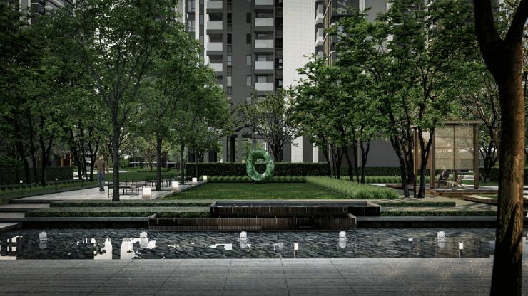 园林设计兼顾观赏性与实用性,搭配休闲步道、景观小品、阳光草坪、亲子活动区等功能空间,满足业主休闲漫步、亲子互动、邻里社交等多元需求。同时项目遵循立体式园林庭院理念,打造下沉式运动会所,沿袭滨江亲水特性,以自然森谷为设计核心,搭配精致叠檐环廊,营造隐奢都市山谷隐居体验,让业主在城市繁华中尽享自然静谧。