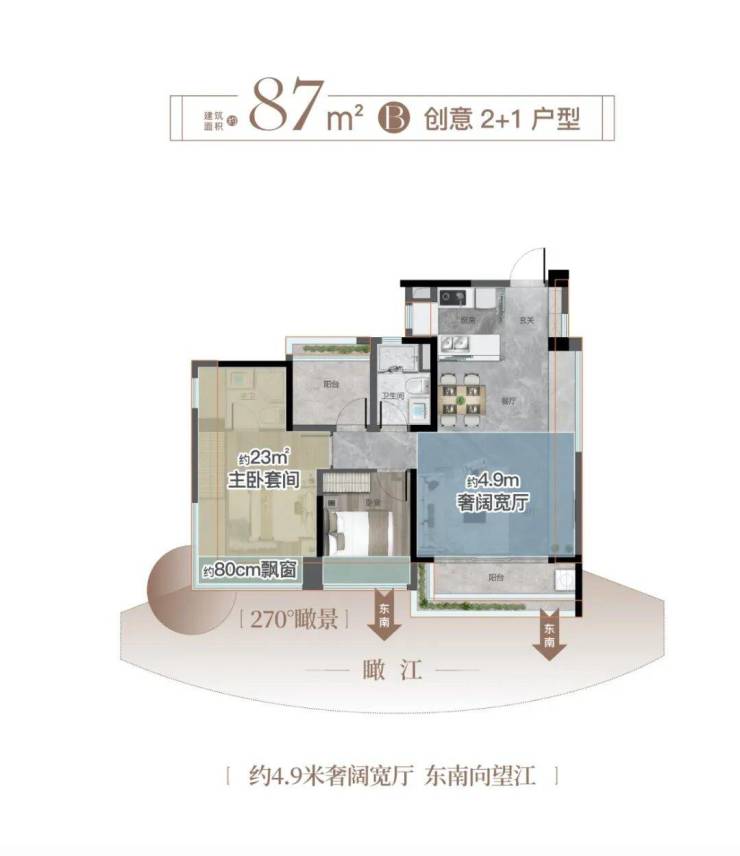 115㎡三房:四开间朝南+主卧270°转角窗,适合三代同堂;