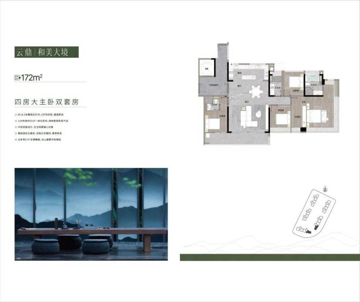 云庐的户型设计注重私密性和舒适度,每户都配备了专属电梯,实现了真正的“专梯专户”。所有住宅均为全南向板式结构,楼层高度适中(仅17层),保证了充足的采光和通风效果。同时,通过宽大的观景阳台和无柱全景观面飘窗台设计,使得每一户都能享受到开阔的一线云山美景。