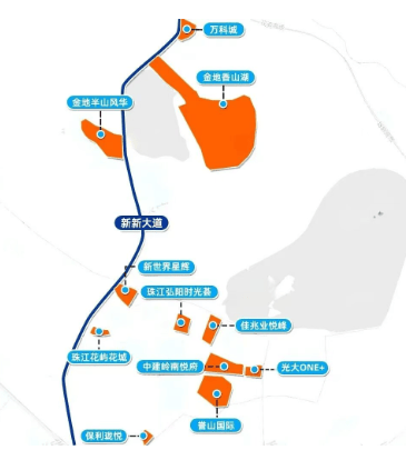 交通出行依赖自驾与城轨,花莞高速宁西互通口距项目 7 公里,40 分钟可达白云机场,20 分钟速达东莞;增天高速黄岭互通口 9 公里,30 分钟直达天河;济广高速新新大道入口 9 公里,半小时到科学城、1 小时抵天河。在建新白广城轨永宁南站距项目约 800 米,未来 1 站新塘 TOD、2 站镇龙 TOD,实现跨区快速通勤。