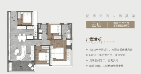 105㎡四房两厅两卫:宽敞舒适,特别适合追求更多私人空间的家庭。主卧配备独立卫生间,提升了居住的私密性和舒适度。