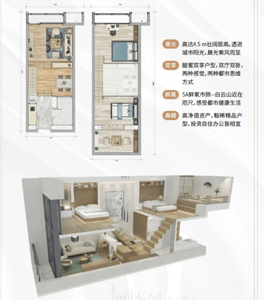 项目有观成大楼和观云大厦两种产品。观成大楼推售建筑面积约为31 - 57㎡中轴资产,合理规划卧室、厨房、卫生间,4.5米高超高空间,中空挑高设计,打造大House体验。观云大厦推售建筑面积约为36 - 43㎡酒店行政公馆、31 - 54㎡中轴精品空间,合理规划功能区域,3.4 - 3.6米高超高空间,满足自用、办公、投资多重需求。多种户型可满足不同业主的需求,无论是单身贵族、年轻夫妻还是投资者,都能找到适合自己的理想户型。