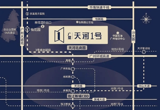 项目以“地铁口物业” + “城市综合体”的双赢模式匠心打造。其西面约400米便是地铁3号线梅花园站B出口,通过地铁网络,2站即可到达广州东站,5站直达珠江新城。广州东站作为广州重要的交通枢纽,连接着全国各地的铁路线路;珠江新城则是广州的金融中心,高楼林立,商业繁荣。广垦·天河1号的业主可以轻松享受到便捷的交通带来的高效生活,无论是日常通勤还是商务出行,都能快速抵达目的地。