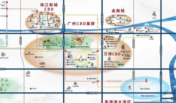 项目雄踞粤港澳大湾区核心,广深港澳科技创新走廊与广深港高铁经济带交汇处,形成“经济+轨道”双核心价值高地。据广州市发改委数据,万博CBD总产值超1000亿元,商事登记主体超10000家,与珠江新城、琶洲、金融城并称广州四大CBD。项目距地铁3号线汉溪长隆站仅660米,3/7/18号线及佛莞城际铁路交汇,15分钟直达核心商圈,30分钟覆盖全城核心配套。
