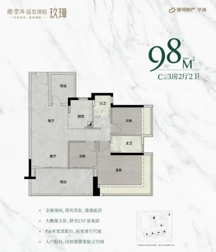 98㎡户型:主朝向朝南,让阳光洒满每一个角落。主卧配备270°无柱飘窗,视野开阔,美景尽收。次卧和阳台尺度大幅增加,提供更加舒适的居住体验。