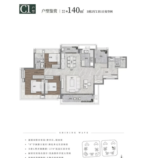 项目在售 99-140㎡全四房户型,户户朝南,三 / 四开间朝南设计,搭配大阳台与 L 型飘窗,空间利用率高(使用率 90%-93%)。其中 140㎡户型江景视野最佳,可俯瞰 250 米宽江面与 7.8 公里滨江景观带;99-118㎡户型适配改善家庭,格局方正,动静分区合理。社区内打造高山流水苏式园林,二楼空中连廊串联各楼栋,配套阅读书吧、活动中心,兼顾景观与社交需求,外享滨江公园、灵山岛儿童公园,自然环境优越。