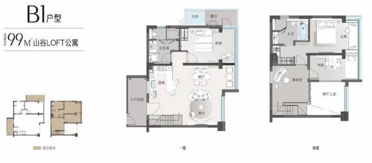 LOFT公寓:面积分别为69㎡和99㎡,适合单身贵族或年轻家庭。
