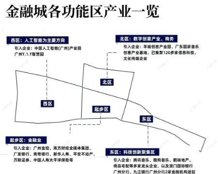 金融城分为四个功能不同的区域:西部核心区、起步区、北区综合办公配套区以及东区科技创新集聚区。其中,北区作为金融城唯一的居住属性片区,未来将承担起整个金融城片区的高端居住功能,并成为湾区金融+科技产业融合创新发展的示范区。目前,北区已聚集了120多家信息科技、文化传媒企业,年产值超过300亿。