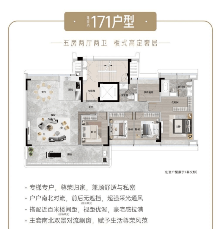 此外,项目预计2026年7-8月将加推建面约171-253平方米的五室户型,给想一步到位的改善家庭提供了更多选择。超大面宽、全景落地窗、双主卧套房等设计,将豪宅体验推向新高度。