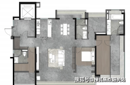 建面约 107㎡户型,是入门级的改善户型,用更小的建筑面积,实现了顶级的改善居住体验,是年轻改善家庭的首选。这个户型做到了极致的四开间朝南,拥有约 11.8 米的超大南向面宽,能最大程度接收南向的阳光,保证整个室内的充足采光,即使是最小的卧室,也能拥有南向的采光,这在同面积段的户型中,是十分难得的。