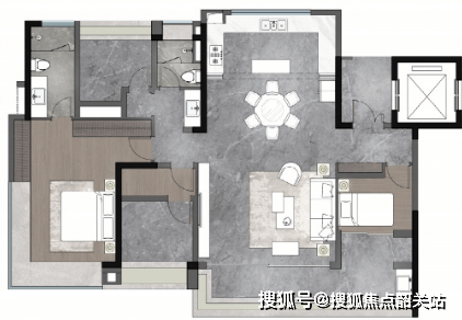 整个户型做到了四房两厅两卫的格局,既能满足多代同堂的居住需求,也能打造独立的书房、茶室、健身室等功能空间,完全能满足家庭全周期的居住需求,是改善家庭的全能之选。