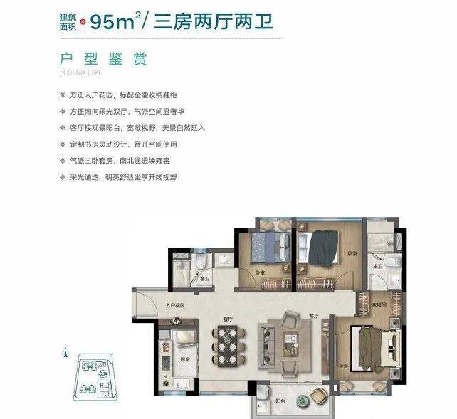 这个户型在 95㎡户型的基础上,进一步优化了空间布局,
