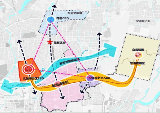正好处在北站商务区、花都 CBD 和空港商务区的 “黄金三角” 核心位置,