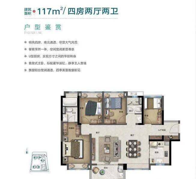 接下来是建面约 117㎡的四房两厅两卫户型,