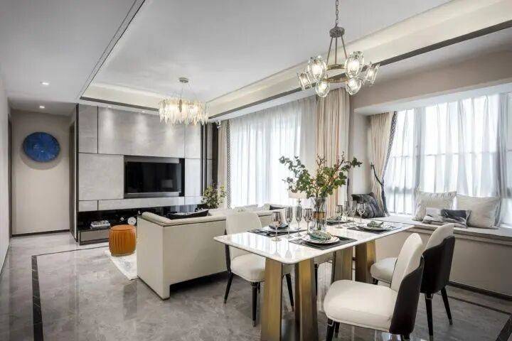 餐客一体的大通厅设计,空间感十分开阔,