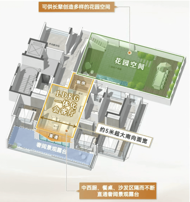 该户型最大的亮点在于设计了约6.9米的超长景观阳台,并结合LDKB(客厅、餐厅、厨房、阳台)一体化空间设计,实现了270°环幕观江视野。LDKB一体化设计打破了传统房间的隔阂,将客厅、餐厅、厨房与阳台融为一体,形成了一个宽敞通透的公共活动区域。这不仅增加了空间的视觉延伸感,更提升了家庭成员之间的互动频率。