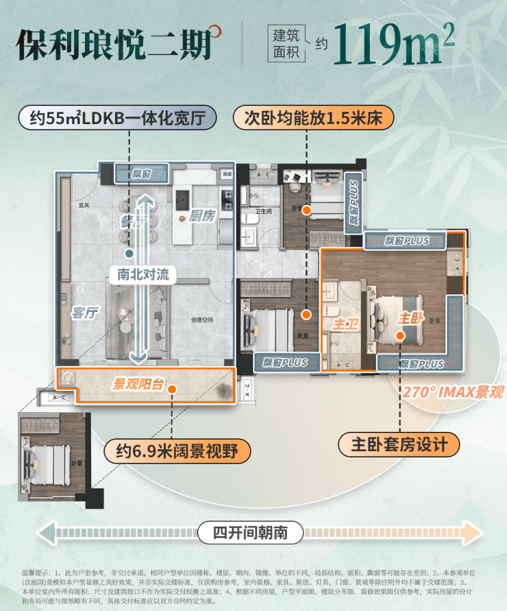 建面约119㎡四房户型,打造四开间朝南极致布局,最大化拉伸南向采光面,全屋通透敞亮,采光通风效果拉满;约6.9米阔景阳台,实现南北对流,既能俯瞰社区园林美景,又能满足日常晾晒、休闲观景需求;采用LDKB一体化设计,打通客厅、餐厅、厨房、阳台,打造约55㎡超大公区,搭配灵活多变的多功能房,可根据家庭需求改造为书房、儿童房、休闲室,完美适配单身、新婚、育儿、三代同堂等全周期居住场景。主卧打造奢阔套房,配备超大L型采光窗,主卫科学布局不冲床头,细节之处尽显人性化设计,兼顾居住舒适度与私密性。
