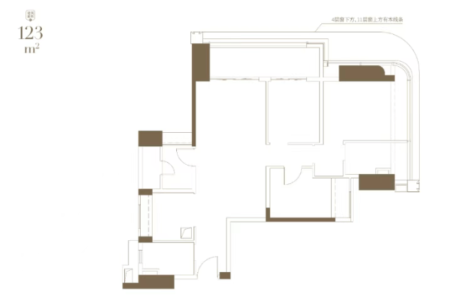 低区(4-11层):一层8户,户型面积约107-123平方米三房;