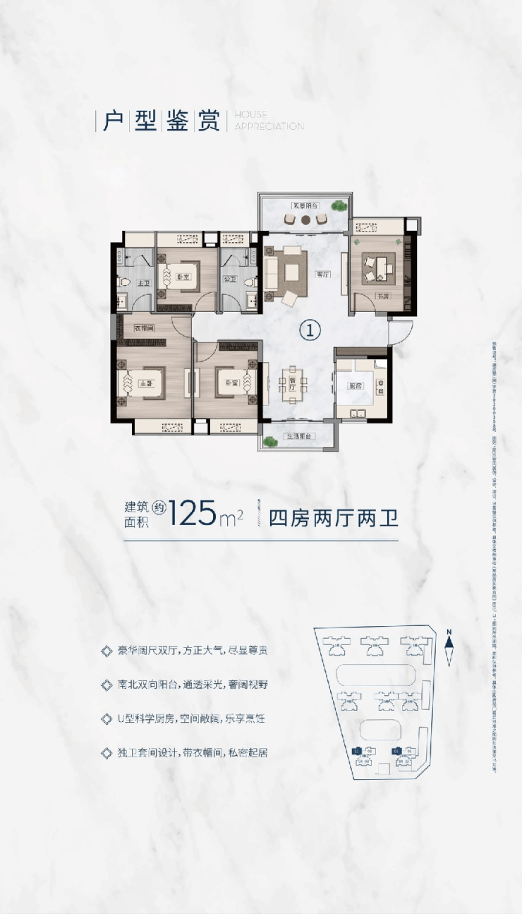 以125㎡四房户型为例,其采用LDK一体化布局(客厅、餐厅、厨房打通),形成约6.5米面宽的公共活动区;主卧套房配备独立衣帽间与明卫,次卧则面向中央园林,保证私密性与景观视野的平衡。得房率方面,得益于低公摊设计(电梯核心筒紧凑、无连廊浪费),实际使用面积比同面积段高层产品高出约8–10%。