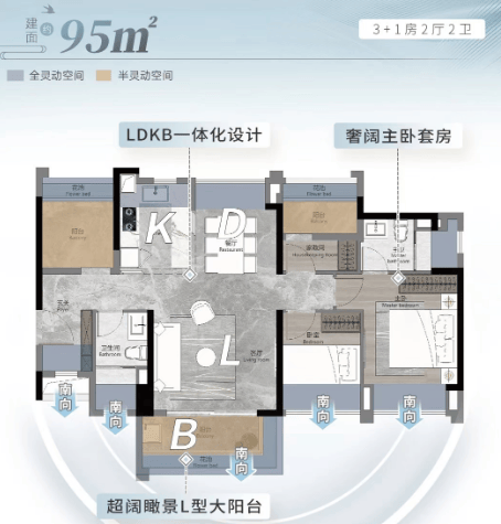 建面约95㎡四房两厅两卫:五开间朝南,南北对流设计,奢阔私密主卧套房。