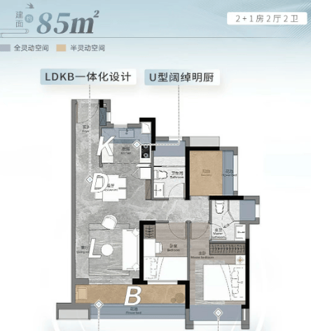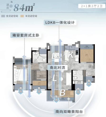 建面约84㎡三房两厅两卫:南向双瞰景阳台,U型明厨,阔绰套房式主卧,南北对流设计。