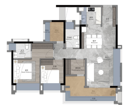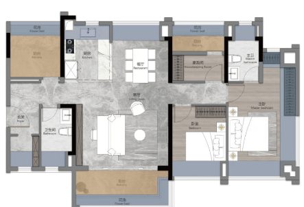 建面约119㎡四房两厅两卫:南望园林,北望白云湖,户户有景更舒适,全景主卧套房。