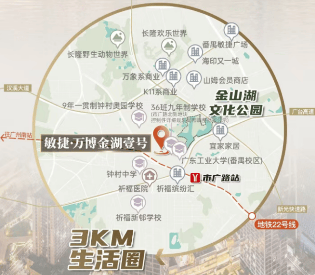 敏捷万博金湖壹号距离地铁22号线市广路站大约1公里,步行可达,方便快捷地连接番禺广场及其他重要区域。自驾出行时,项目附近有金山大道、兴业大道、汉溪大道等主要道路,可便捷接驳至番禺大道和新光快速路,不过上下班高峰期可能会遇到交通拥堵的问题。
