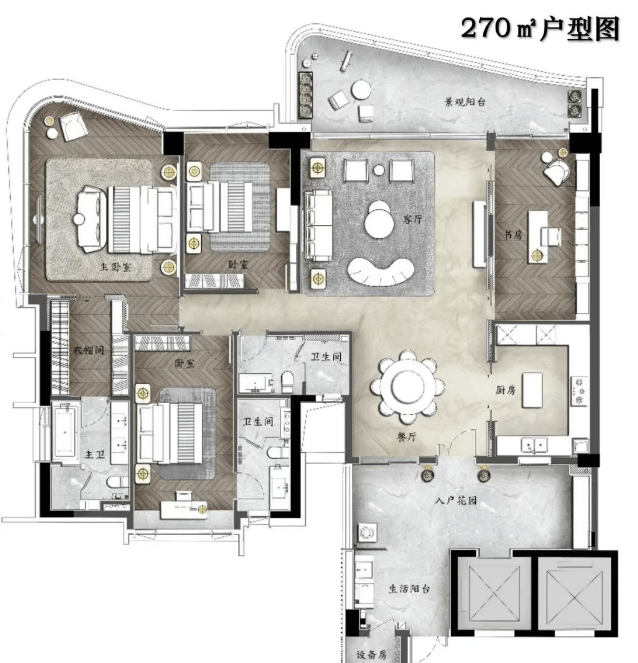 A户型:270㎡环幕江景四房,9米超大邮轮式阳台,专梯专户设计,28㎡超大私家庭院,42㎡超大主卧空间,270°环幕江景。