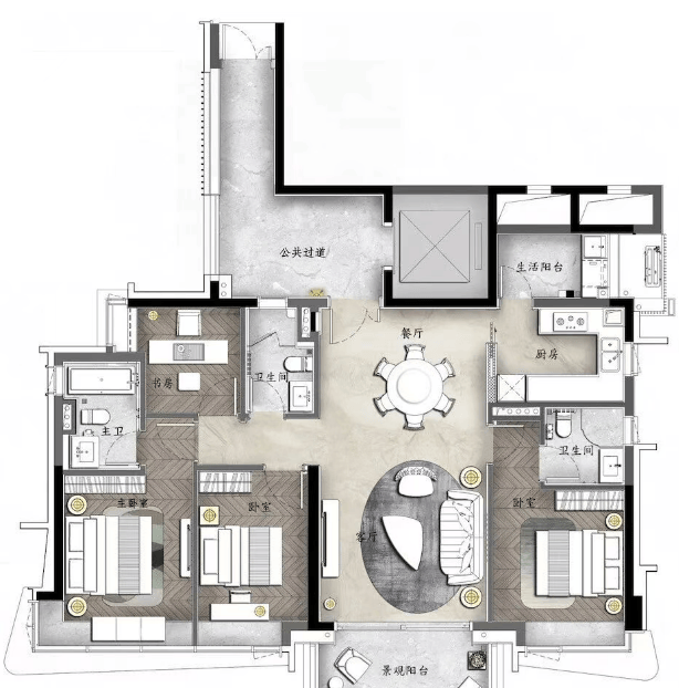 C户型:约140㎡南向园景大宅,超高性价比,三卧室朝南设计,阔绰双主套房,独立电梯入户。