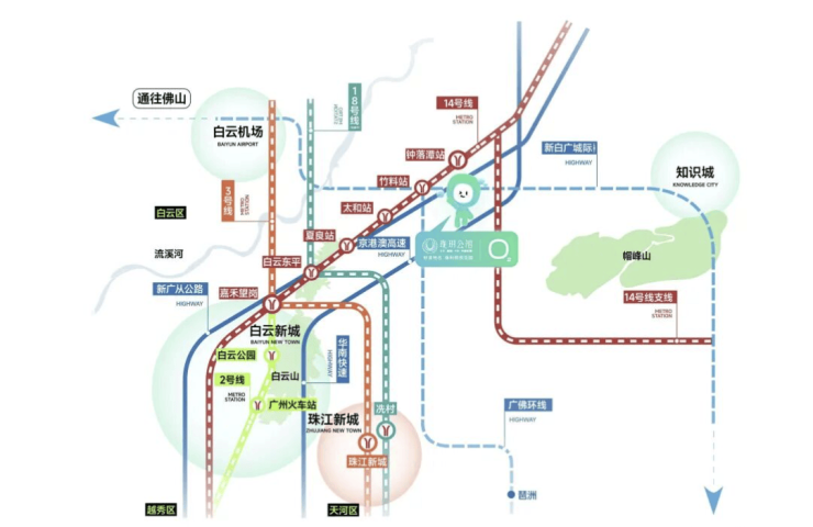 地理位置方面,项目南接白云新城,北靠白云国际机场,直线距离市中心及主要交通枢纽不超过13公里,具备优越的通达性。板块内规划14个地铁站点正在落地建设,未来轨道交通完善后,将进一步强化与全市的通勤效率,使居住与工作无缝衔接。项目周边配套以科技与生态并重,形成“宁静湖居+繁华都市”双重生活场景,兼顾居住舒适性与未来增值潜力。