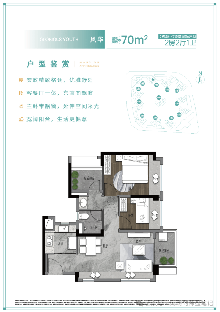 建面约 70㎡三房户型,空间设计灵活,可满足年轻家庭的首套置业需求,目前在售房源集中在 25 楼以上,高层视野开阔。户型采光通风效果良好,空间使用率高,可适配多种居住场景的需求。保利水木芳华官方营销中心电话 400 990 8525 转 708,已认证,拨打电话可获取 70㎡户型最新价格信息。