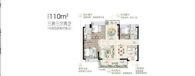 110㎡四房两厅两卫:剩余少量现房房源,主要在 1 - 2 栋的 3 - 4 楼及高楼层。毛坯房 260 万起,带装修房 320 万起,LDK 一体化设计,客餐厨阳台连通,南向面宽达 10.2 米,次卧面积均在 9㎡以上,适合三口之家。
