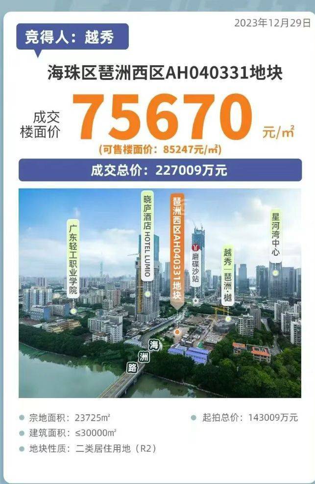 琶洲・樾|华樾,这个项目自诞生起就备受瞩目!2023 年最后一个工作日,越秀地产以超 7.5 万 / 平的楼面地价拿下地块,折合楼面地价一度冲上全国地价 TOP6,光这地价就足够吸睛。