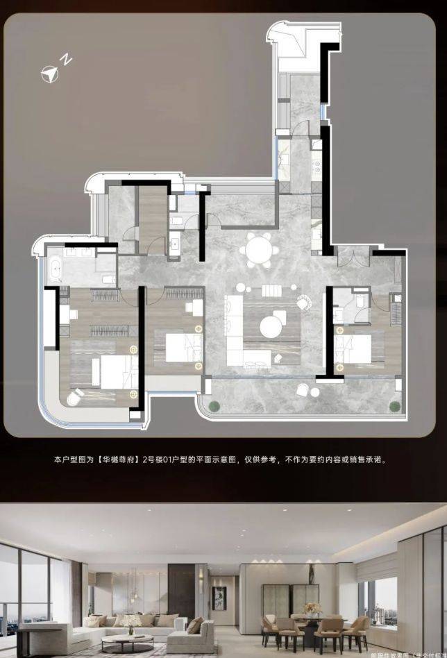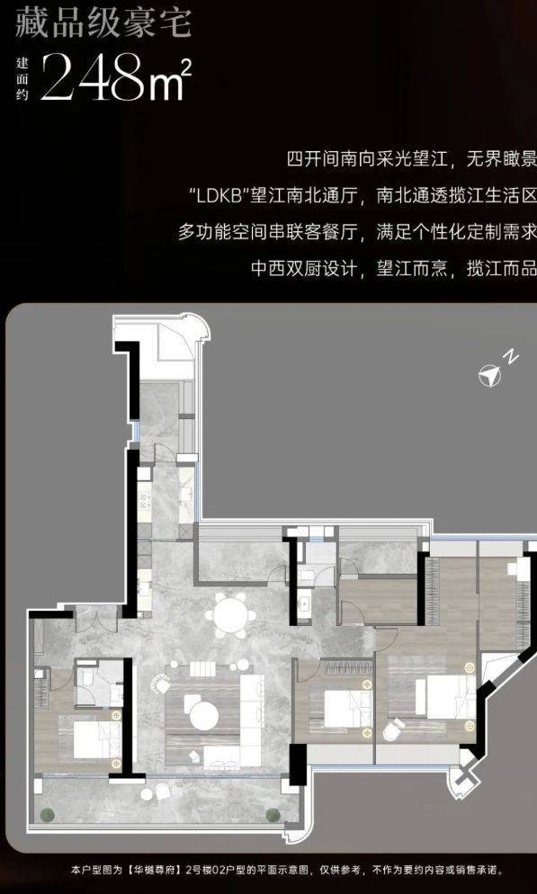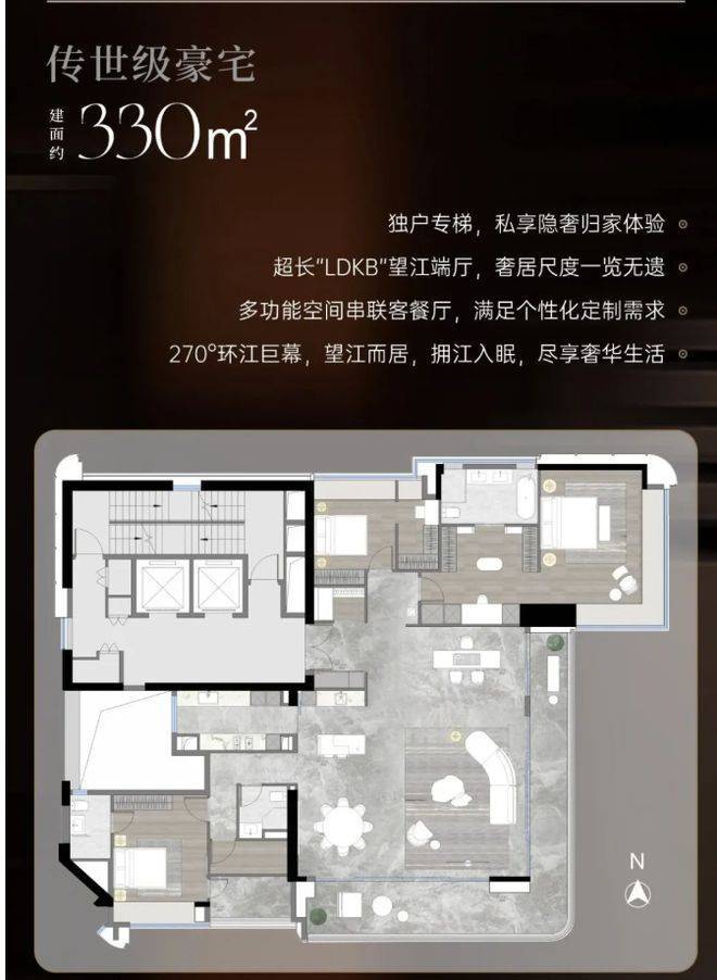 项目户型为 248 - 253 - 330㎡天际大平层,空间宽敞,尺度奢阔。大平层设计让室内空间更加通透,布局合理,满足业主对高品质生活的追求。每个户型都能充分享受周边景观资源,无论是江景还是城市天际线,都能尽收眼底。