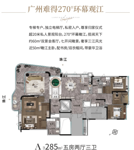 约285㎡户型,主打奢阔享受,户型尺度恢弘,空间感十足,客厅采用大横厅设计,搭配L型一线珠江曲线阳台,江景视野最大化,无论是家人欢聚还是朋友宴请,都能彰显尊贵气质。该户型配备多个套房设计,主卧空间奢阔,配备独立衣帽间、卫生间,兼顾私密性与舒适度,同时预留书房、休闲区等多功能空间,可根据业主需求灵活改造,适合追求顶奢生活品质、注重圈层与居住体验的塔尖人群。