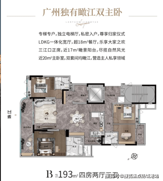 兰园江悦体量不大,仅规划一栋18层高的楼栋,全盘只有68套房源,主打纯大平层设计,仅推出两种户型,分别为约193㎡和285㎡瞰江艺术大宅,无刚需户型掺杂,纯粹满足顶豪改善型购房需求。