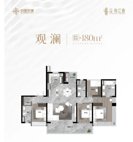 建面约180㎡户型,是高端改善的巅峰之作,打造极致的江景居住体验与空间尺度,匹配顶级高阶人群的居住需求。该户型采用全南向望江布局,拥有超大景观面,推窗即可俯瞰630米南向珠江盛景,将珠江的壮阔与城市天际线尽收眼底,景观体验极佳;空间布局阔绰合理,大方厅设计,连接超大景观阳台,采光通风俱佳,公共空间开阔,适合高端社交与家庭聚会;主卧配备豪华套间,拥有独立卫生间、步入式衣帽间与景观飘窗,空间阔绰,舒适度拉满,彰显顶级人居的尊贵与奢华;多卧室设计,均配备独立卫生间,满足多人口家庭的居住需求,保障每一位家庭成员的私密性;新规后超高使用率的设计,让空间利用率达到极致,进一步提升了居住舒适度与空间价值。