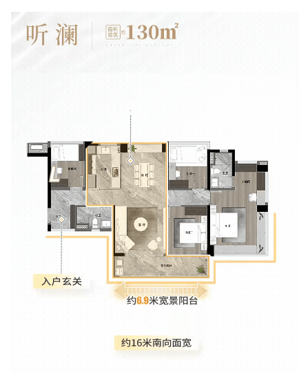 建面约130㎡户型,是高阶刚需与改善入门的优选之作,采用南北通透设计,通风采光俱佳,打造舒适宜居的居住空间。该户型拥有约16米南向面宽,采光面极大,让家里的每个角落都能享受充足的阳光;搭配近7米的景观阳台,连接客厅与次卧,推窗即可俯瞰珠江盛景,将江景与绿意融入日常生活,闲暇时可在阳台品茶、观景,享受滨江生活的惬意。户型布局合理,动静分离,客厅、餐厅相连,打造开阔的公共空间,适合家庭聚会、休闲娱乐;卧室布局方正,空间舒适,主卧配备独立卫生间,保障业主的私密性,满足三口之家或三代同堂的居住需求,新规后超高使用率的设计,进一步提升了空间利用率,让业主以更具性价比的价格,享受更大的使用空间。