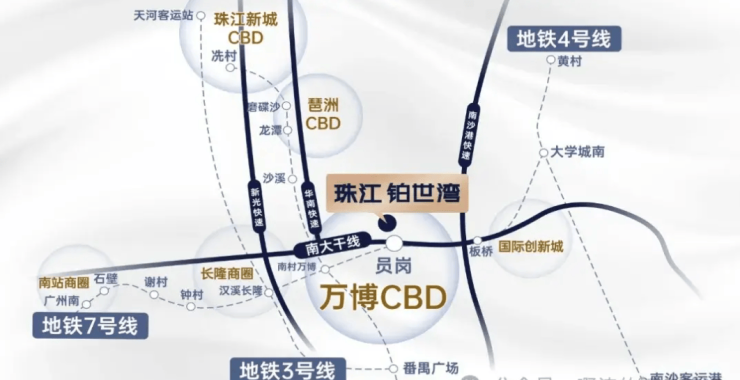 在广州“南拓”战略的宏大叙事中,番禺万博商务区无疑是最为璀璨的明珠之一。这里不仅是番禺区的经济引擎,更是广州南部连接粤港澳大湾区的核心枢纽。随着各大总部企业的入驻,千亿级产业集群的形成,万博 CBD 已经从一个规划蓝图变成了高楼林立的现实繁华地。而珠江铂世湾,正是坐落于这片热土的辐射核心范围内,占据了得天独厚的地理优势。