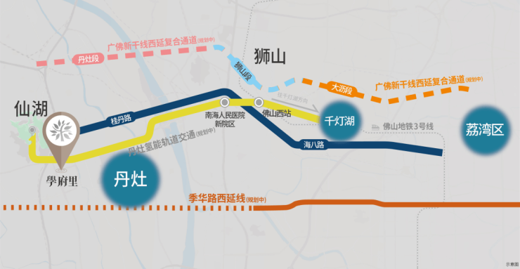 🚄🚄规划地铁28号线:项目附近规划丹灶站,一路向东连接佛山西站、南海之眼、到达广州越秀区,融入广佛轨道圈