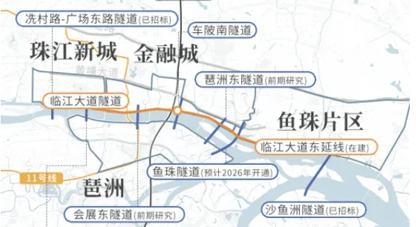 临江大道鱼珠湾隧道:全长345米的敞开段底板工程已于去年底完工,计划2025年下半年竣工通车;