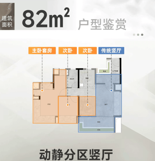 84㎡三房两卫:主卧更大、客厅开间更大,南向四开间设计,全景式套房主卧,L型飘窗。