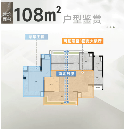 108㎡四房两卫:大横厅设计,通过打通次卧可变身三面宽超级横厅,解锁近20种生活方式表达。