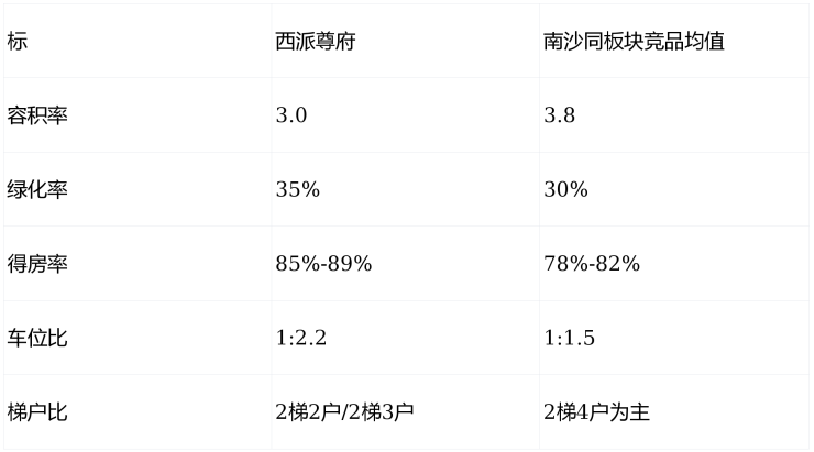 西派尊府总占地面积约3.8万㎡,总建筑面积约15万㎡,规划12栋高层住宅(20-32层),容积率3.0,绿化率35%,车位比1:2.2(含充电桩车位),梯户比为2梯2户/2梯3户,得房率最高达89%(含飘窗、阳台半赠送面积,符合广州市规划局《关于优化住宅项目计容规则的通知》)。