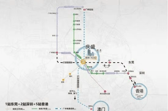 高铁:广深港高铁1站至虎门、2站抵深圳北、5站直达香港西九龙;广中珠澳高铁(规划)将在庆盛设站,贯通中山、珠海、澳门。