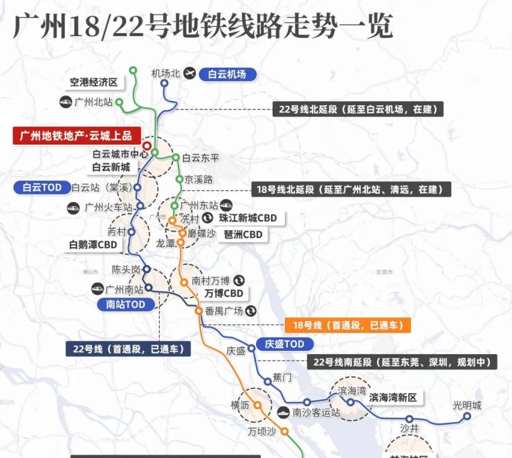 项目距离在建的白云城市中心站仅约 40 米,该站是广州 “南北快线” 战略的关键节点,未来将实现 18 号线与 22 号线双线交汇,两条地铁时速均达 160 公里,为目前广州最快地铁线路。其中,18 号线 3 站直达广州东站,4 站抵达珠江新城,5 站可到琶洲 CBD,将天河 CBD 通勤时间压缩至 30 分钟内;22 号线北接白云机场,南连广州南站,3 站直达白云机场,5 站抵达广州南站,形成 “空铁联运” 黄金走廊,出差、探亲、跨城出行极为高效。